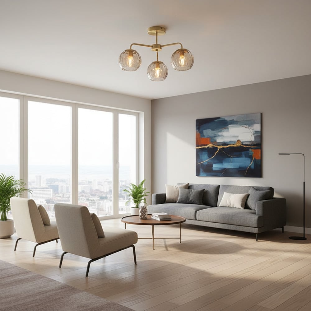 This ceiling light features a stunning brass finish that exudes a warm and luxurious aura. Its three dimpled, globe-shaped glass shades not only add a unique and stylish touch but also diffuse light beautifully, creating a soft and inviting glow in any room. Designed as a semi-flush fixture, it is ideal for spaces with lower ceilings, providing ample illumination without overwhelming the area.